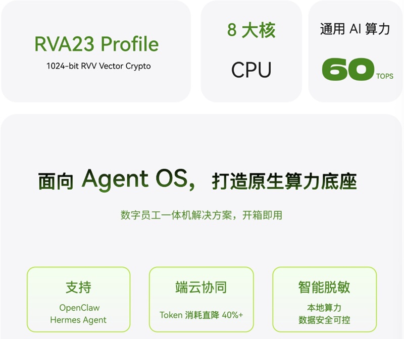 作为全球首颗符合 RVA23 规范的 RISC-V 量产芯片,采用同构融合计算技术 ,集成 8 个高性能计算大核与 8 个超宽并行 AI 核,可提供130 KDMIPS 通用算力及 60TOPS 通用 AI 算力,实现 300-800 亿参数大模型本地运行,性能体验与主流桌面 CPU 相当,适配 AI 计算机、AI 机器人等高端应用场景。