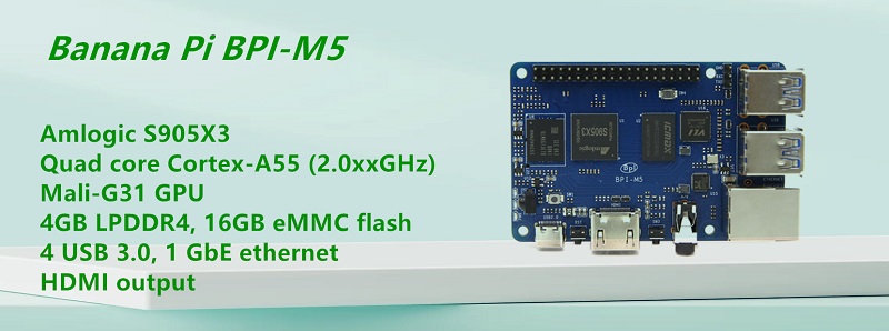Banana Pi BPI-M5 is a new generation single board computer design , use Amlogic S905X3 Quad-Core Cortex-A55 (2.0xxGHz) Processor. Mali-G31 MP2 GPU with 4 x Execution Engines (650Mhz). BPI-M5 will come with 4GB LPDDR4 RAM, 16GB eMMC flash, and offers four USB 3.0 ports, one Gigabit Ethernet port, and on HDMI 2.1 output port for 4K video output.